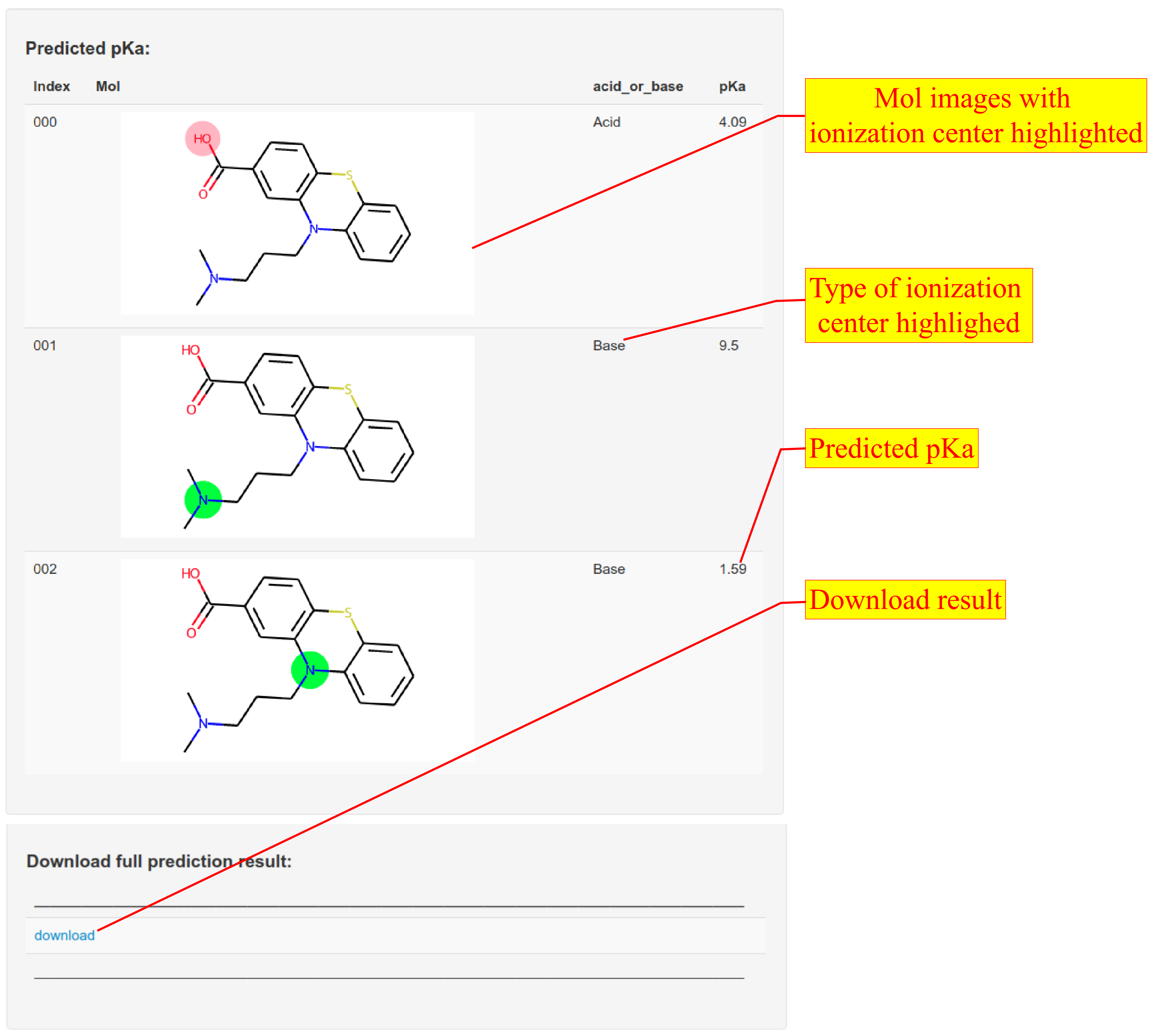 2. The server extracts all ionization centers on the input molecule and predicts pKa for each ionizable group by graph-convolutional neural network. The result page shows information of all ionization centers and predicted pka.